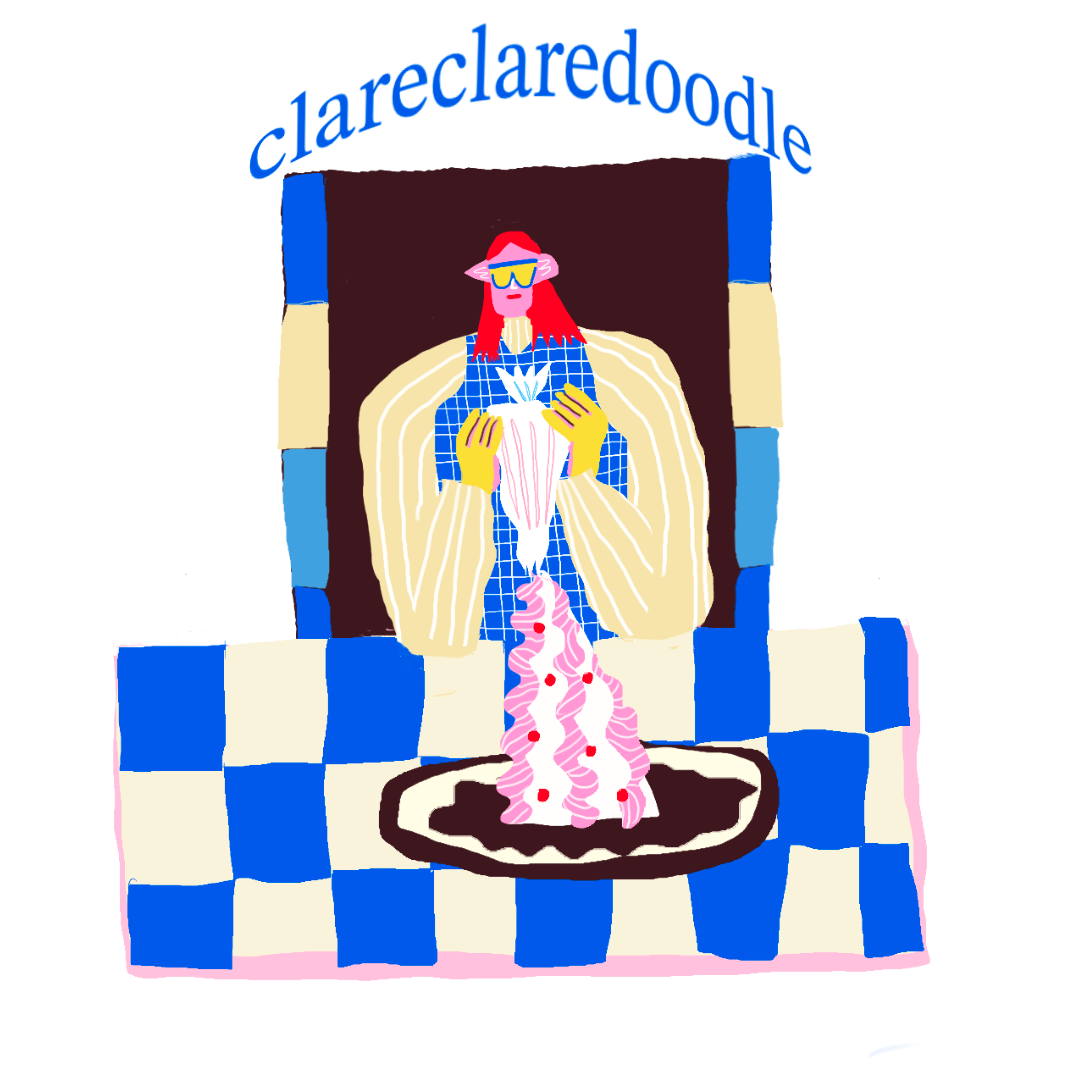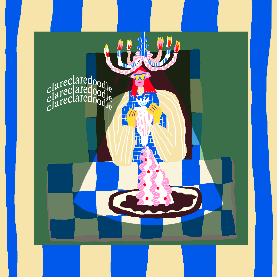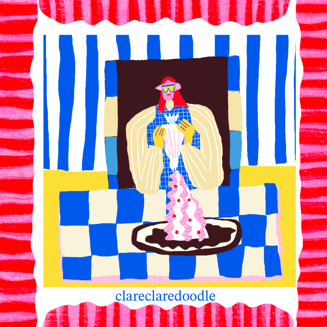 This is a digital artwork created in 2023. It depicts a figure decorating a cone-shaped cake with whipped cream. The artwork captures a delicious moment with a fun and colorful impression.