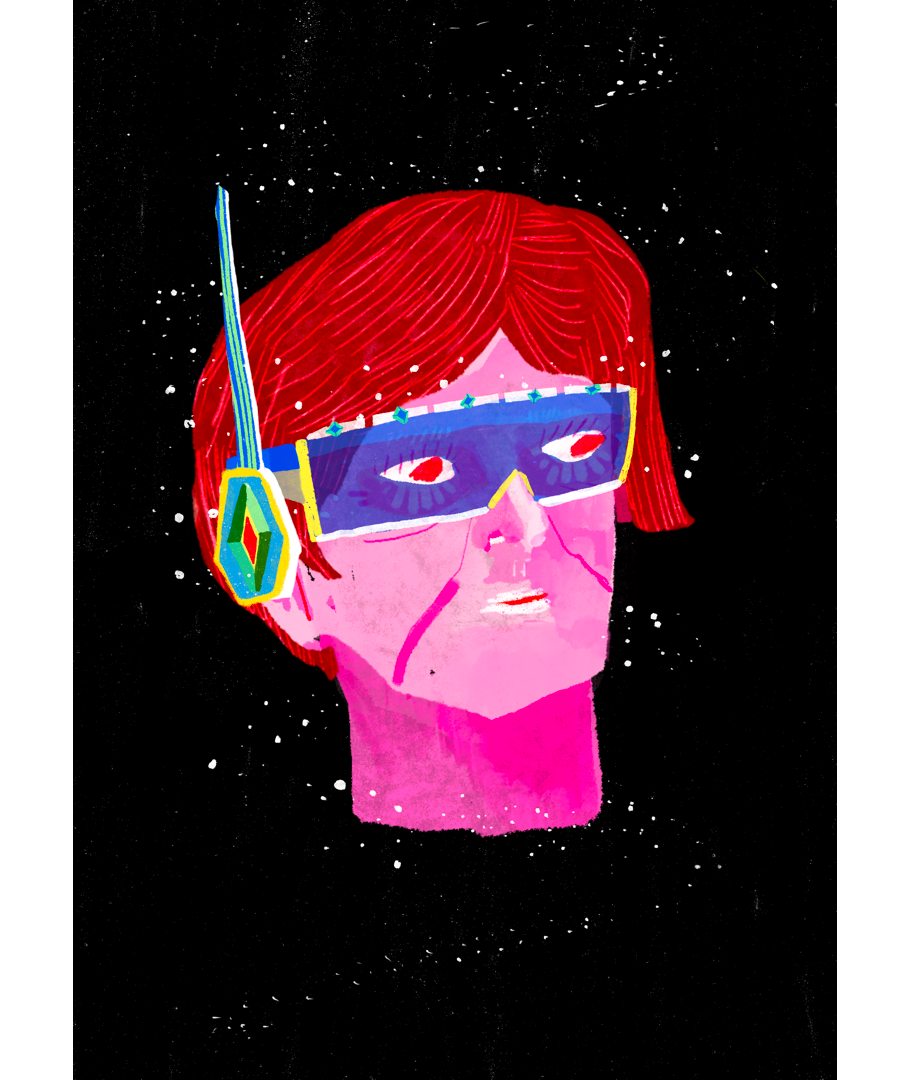 A pink figure with special goggles drifts through space.